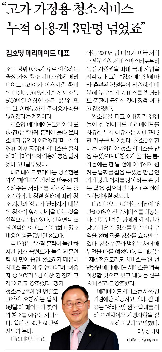[인터뷰] 김호영 메리메이드 대표 "고가 가정용 청소서비스 누적 이용객 3만명 넘었죠" (한국경제)