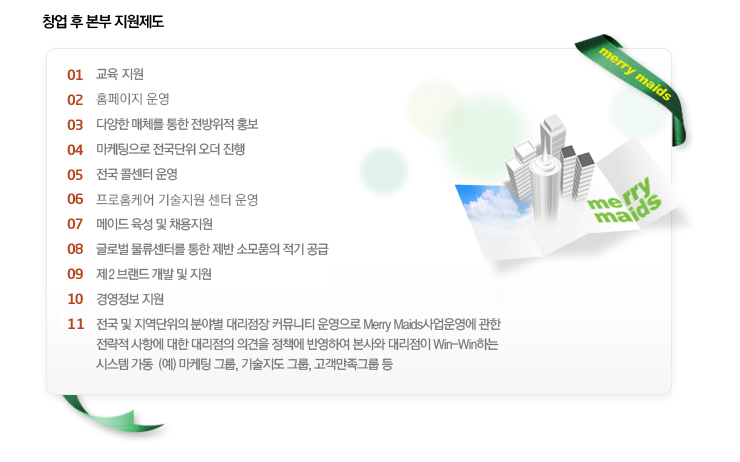 merry maids의 독특하고 전문적인 홈 크리닝 서비스 시스템은 2인 1조의 크리닝 전문가에 의해 행해지는 효과적이고 철저한 크리닝으로 합리적인 관리방식과 검증된 마케팅 절차가 잘 조화된 과학적 시스템 입니다.