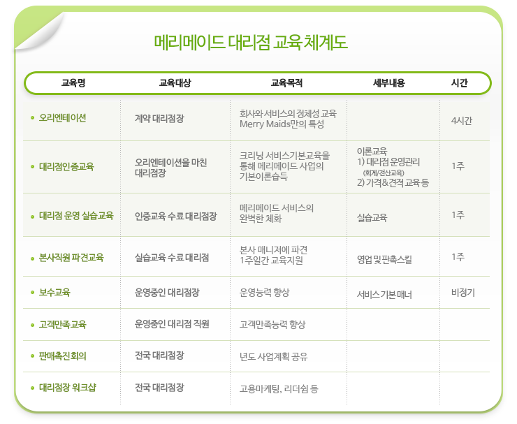 메리메이드가 고객을 위하여 구축한 시스템과 서비스 수준을 대리점에서도 동일한 품질과 서비스로 운영할 수 있는 능력의 배양이 사업 성공에 있어서의 중요한 포인트임을 감안하여 가맹점 개설부터 계약기간이 종료되는 시점까지 체계적이고 지속적인 교육과 지원을 아끼지 않습니다.