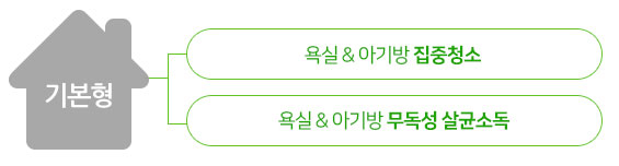 위생관리가 꼭 필요한 주방과 욕실, 아기방의 먼지와 오염 제거, 알레르기성 질환이나 아토피를 유발하는 매트리스, 소파등의 집먼지 진드기를 없애주고 마지막으로 집안 전체 살균소독으로 세균과 박테리아를 제거합니다. 에어컨&세탁기 분해청소, 새집증후군 처리와 피톤치드 서비스는 고객님 집안의 상황에 따라 선택적으로 적용할 수 있도록 도와드리는 맞춤형 컨설팅 서비스입니다. 베이비 홈케어 서비스는 고객님 댁을 엄마와 아기들을 위한 쾌적하고 건강한 육아환경으로 만들어 드립니다.